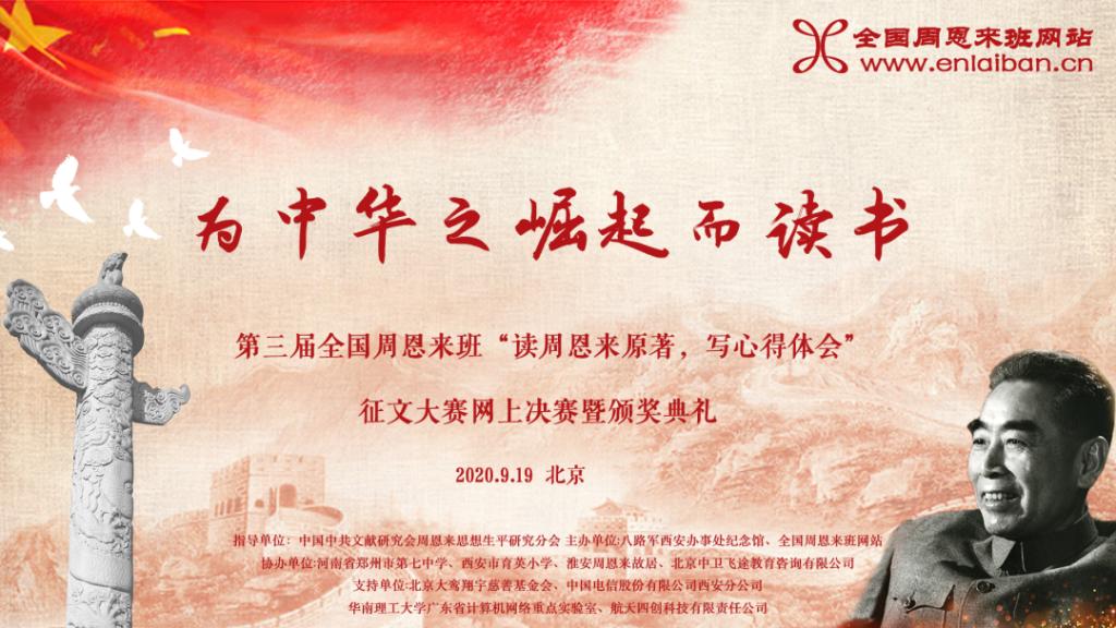 2020年9月19日,“为中华之崛起而读书——第三届全国周恩来班征文比赛” 在北京以线上(云直播)方式开展大赛决赛及颁奖典礼。我院学生姚睿洁(原汉语言1801),经过激烈比拼,荣获大学组一等奖与最佳人气展评奖。
