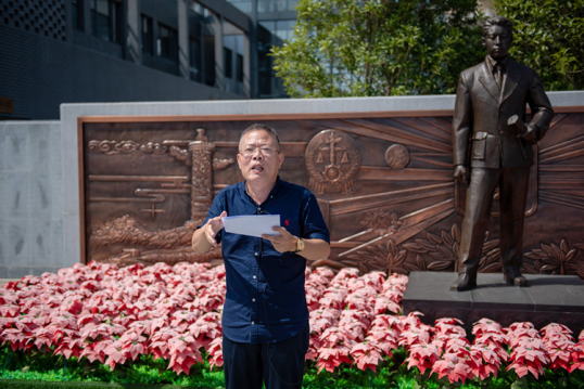 “勤奋学习,进德修业;志存高远,开拓创新;弘扬革命精神,传承红色基因;挥法律之利剑,持正义之天平;立志为社会主义法治事业奋斗终身!”面对梁柏台先生雕像,全体学生激昂宣誓,立志将传承和弘扬梁柏台法治精神,成为新时代中国特色社会主义法治人才。