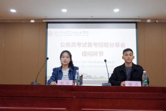 两位结合自身备考经历梳理了整体的备考规划。首先由戴式进行分享,他针对岗位选择、信息渠道、公考软件、报名时间四个方面,结合自己备考的经历经验提出了中肯的建议。随后杜昕也以幽默诙谐的语言和大家分享了自身的考公经历,她总结了四点经验,分别是重视错题、字体公正、报班选择、备考心态。在最后的提问环节中,同学们也积极参与、交流互动。