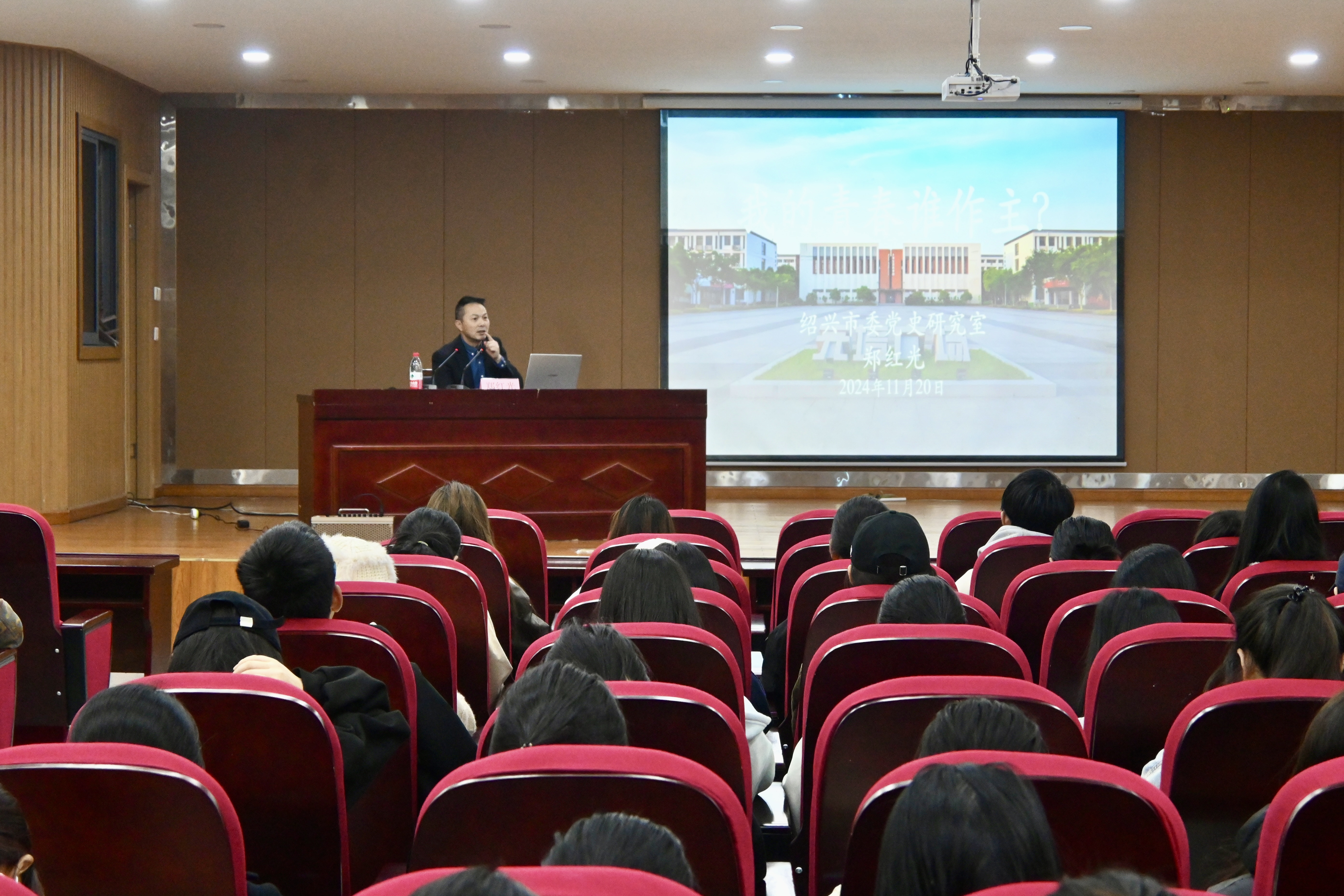 为庆祝中华人民共和国成立75周年,深入学习宣传贯彻党的二十大和二十届三中全会精神,激发青年学生的奋斗热情,树立坚定的理想信念,明确奋斗目标,我院“红色讲堂”第13讲邀请绍兴市委党史研究室副主任郑红光做“我的青春谁作主”的主题讲座。