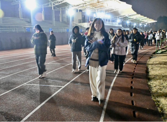 活动现场,参与夜跑的同学们早早地汇聚在校园操场,每个人的手上都佩戴着色彩鲜艳的荧光手环,在夜幕的映衬下闪烁着青春的光芒,形成了一道亮丽的风景线。在充分的热身运动之后,随着充满激情与活力的动感音乐轰然响起,李院长和石书记率先领跑,带领着浩浩荡荡的学生队伍正式踏上夜跑征程。与此同时,操场广播精心准备了丰富多样的音乐曲目,流行、摇滚、电子等多种风格的音乐交替奏响,精准地配合着同学们的跑步节奏。每一位参与者都仿佛沉浸在音乐的海洋中,步伐不自觉地随着节拍律动,原本常规的夜跑瞬间演变成一场洋溢着青春活力的律动感盛宴。音乐的魅力不仅极大地增添了夜跑过程中的趣味性,更有效地激发了同学们内心深处的运动热情,使得平日里或许会让人稍感漫长疲惫的跑步距离,在音乐的奇妙助力下变得轻松愉悦、意犹未尽。