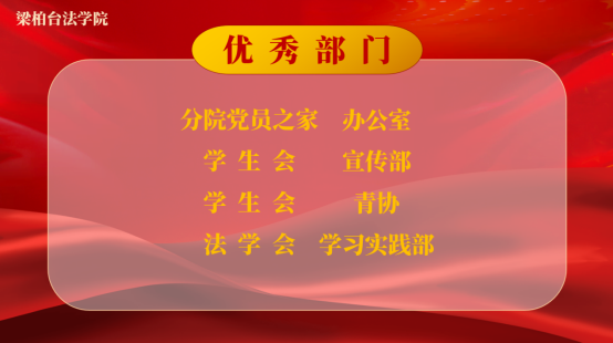 随后,大会进入表彰环节。本年度共评选出分院党员之家办公室、学生会青协、学生会宣传部、法学会学习实践部四个优秀部门,这些部门在组织建设、活动开展、团队协作等方面表现突出,为分院的学生工作树立了榜样。同时,22 名优秀骨干和 45 名优秀成员也受到了表彰,他们在各自的岗位上兢兢业业、无私奉献,以高度的责任感和使命感出色地完成了各项任务,为学、分院的发展贡献了自己的智慧和力量。