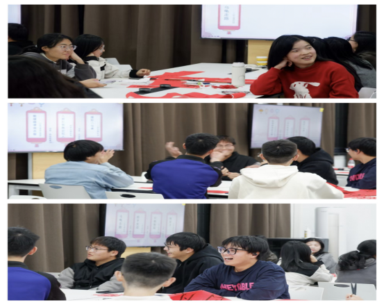 猜灯谜,也称之为“打灯谜”,是中国独特的民俗文娱活动形式,其不仅富有娱乐性,更蕴含着深厚的文化内涵。法学2402班将刑民商宪等法律知识融入灯谜中,学子们围坐在一起,你一言我一语地猜着灯谜,现场气氛紧张又热烈。“猜谜环节非常有趣!例如,当屏幕上出现了“颜字不须打一法学名词”的谜题时,整个班级就陷入一片安静,同学们各自沉思。我也是绞尽脑汁,在脑海里翻箱倒柜地搜寻着知识的碎片。当有人猜出答案是“遗产”时,所有人的欢呼声和惊叹声交织在一起,简直能冲破屋顶。”李馨媛笑逐颜开地叙述。一道道灯谜,不仅提高了普法实效,促进了法治与文化的融合,更让法学2402的青年学子们在传统娱乐活动中受到了法治文化的熏陶。