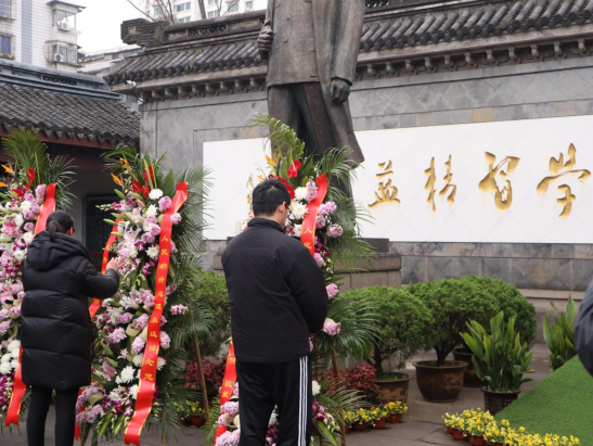 上午9时,纪念仪式在周恩来纪念广场正式开始。学院师生代表与绍兴市周恩来研究会成员、社会各界人士共同向周恩来铜像敬献花篮。花篮缎带上“人民的好总理”六个鎏金大字庄严肃穆,全体人员向铜像行三鞠躬礼,致以最深切的敬意。