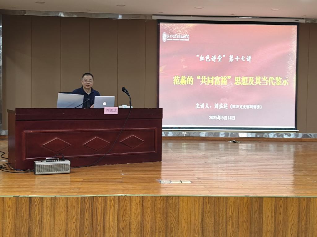5月14日下午,学院“红色讲堂”第17讲在红色学府红色报告厅成功举办。本次讲座特别邀请绍兴文史馆副馆长、绍兴市委宣传部原常务副部长、市文联原主席刘孟达作 “范蠡的‘共同富裕’思想及其当代鉴示”专题讲座。马克思主义分院教师和学生代表聆听了讲座。马克思主义分院副院长苏志富主持讲座。