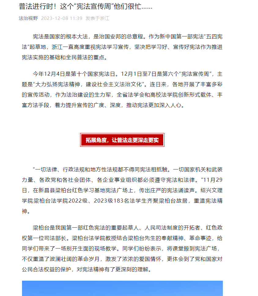 12月8日,法治视野公众号以“普法进行时!这个“宪法宣传周”他们很忙……”为题,报道我院2022级、2023级全体学生在第十个国家宪法宣传日即将到来之际,前往新昌梁柏台故居进行一场别开生面的现场学习。新闻链接如下:https://tidenews.com.cn/news.html?id=2667615。