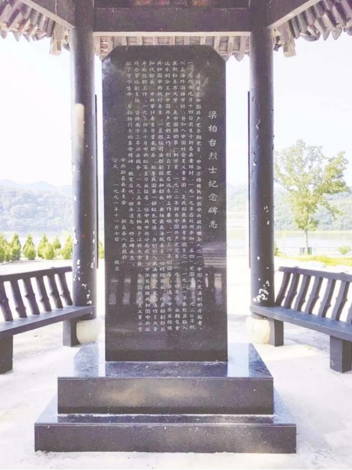 梁柏台烈士纪念碑位于浙江省新昌县梁柏台红色教育基地,碑身高2.15米,宽0.8米,碑正面刻有肖劲光大将题写的8个镏金大字——“梁柏台烈士纪念碑”,背面是碑志,全文如下: